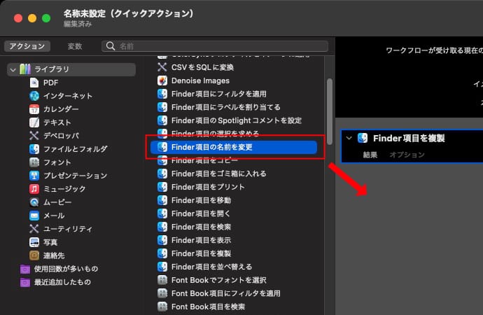画面左側のアクションのライブラリにある「Finder項目の名前を変更」をワークフローにドラッグして追加します。