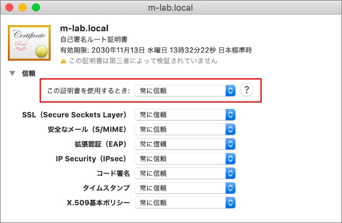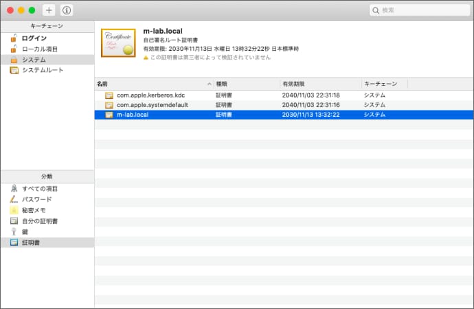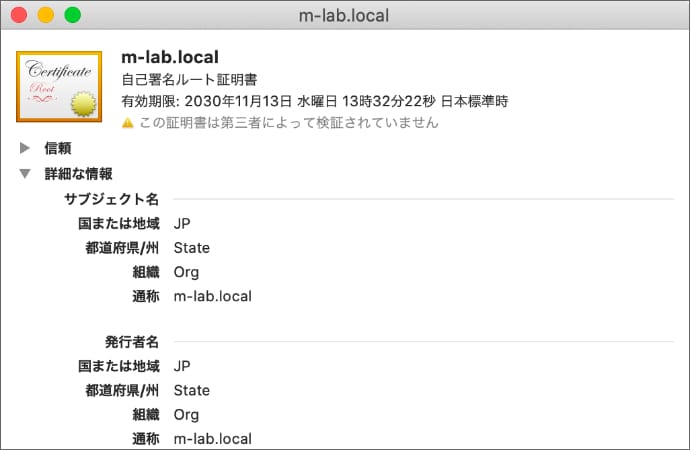 そのままキーチェーンアクセス内のm-lab.localをダブルクリックすると、詳細が表示されます。
