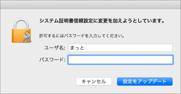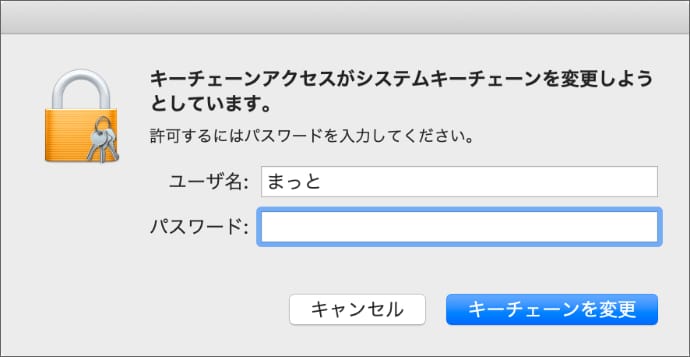 パスワードが要求されるので、Macのログインパスワードを入力します。
