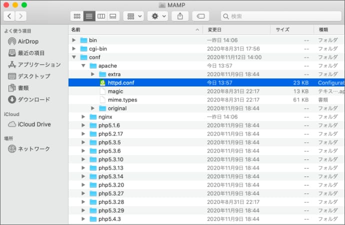 MAMPのApache設定ファイルは「/Applications/MAMP/conf/apache/httpd.conf」です。