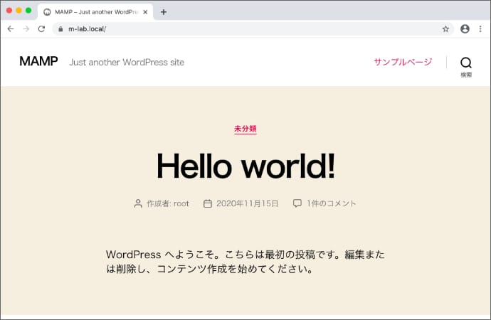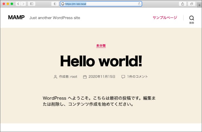 MAMPを起動してSafariでhttps://m-lab.localを開くと問題なく表示されました※WordPressのサイトURL設定はhttps://m-lab.localに変えてます。