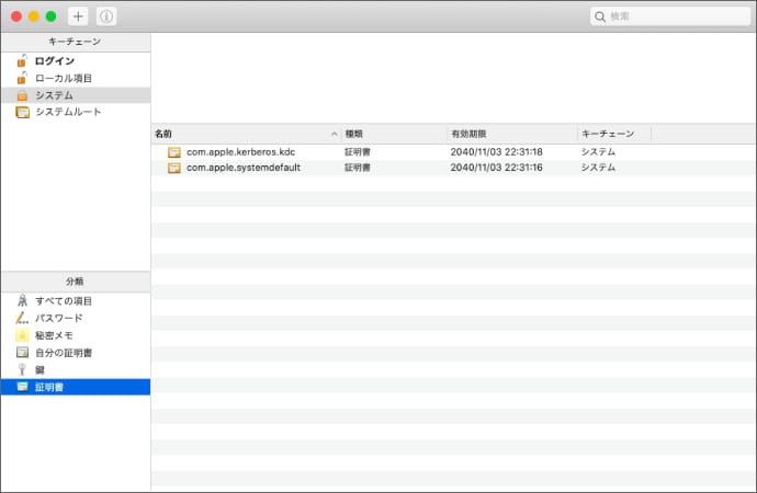 キーチェーンアクセスを開き、システム→証明書をクリックします。
