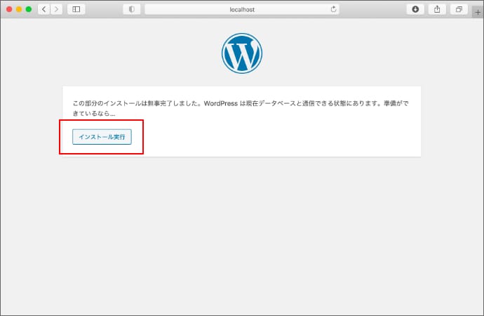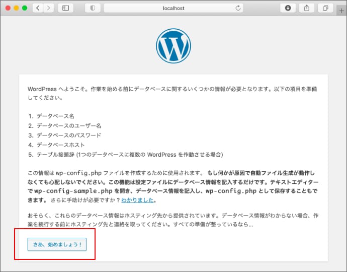 ブラウザでWordPressを保存したページ(今回はドキュメントルート直下なのでhttp://localhost:8888です。)を開くとWordPressのインストールページが開くので、「さあ、始めましょう!」をクリックします。