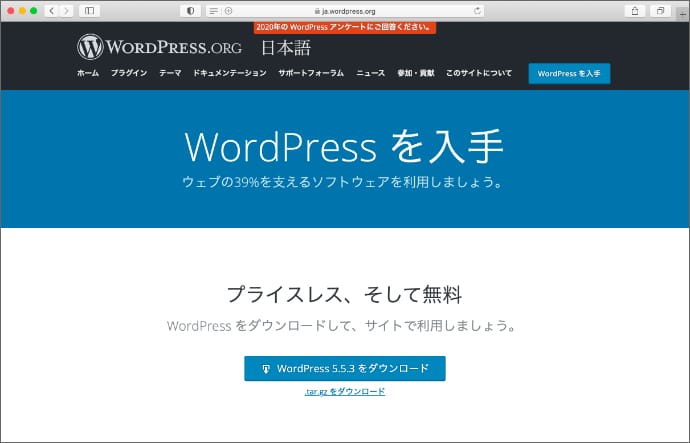 WordPress日本語ダウンロードページから、現在の最新のWordPress 5.5.3をダウンロードします。