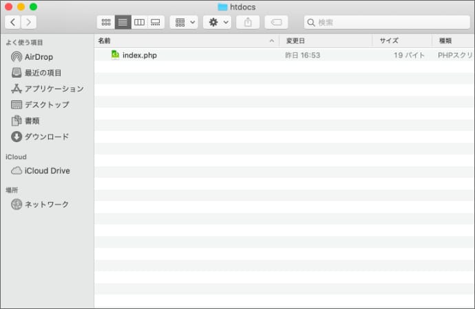 現在のドキュメントルートはデフォルトから変更してないので/Applications/MAMP/htdocsです。すでにあるindex.phpはいらないので削除します。