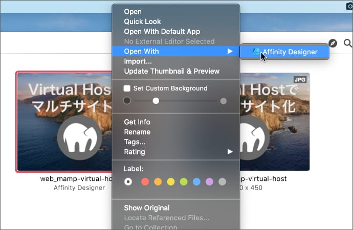 プレビューを見るだけじゃなくて、右クリックメニューから直接Affinity Designerを開いて編集することもできます。
